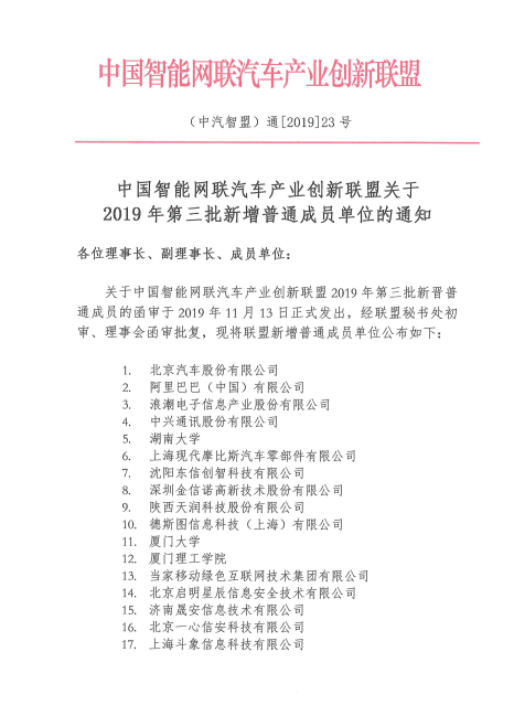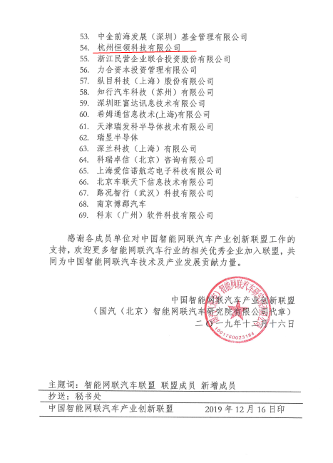 2019年12月16日,通过严格的资质审核以及函审批复,杭州香蕉视频下载安装科技有限公司成功加入中国智能网联汽车产业创新联盟(CAICV),成为该联盟的正式成员并予以公示。(详见“中国智能网联汽车产业创新联盟关于2019年第三批新增普通成员单位的通知”)