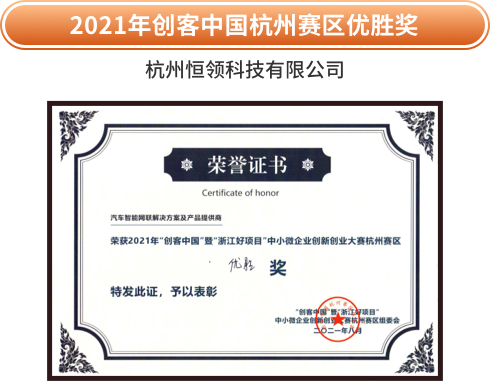 2021年“创客中国”暨“浙江好项目”中小微企业创新创业大赛杭州赛区总决赛上,钱江世纪城5家高科技企业斩获5块奖牌,其中杭州香蕉视频下载安装科技有限公司——汽车智能网联解决方案及产品提供商的项目获得杭州赛区优胜奖、汽车产业链组冠军。